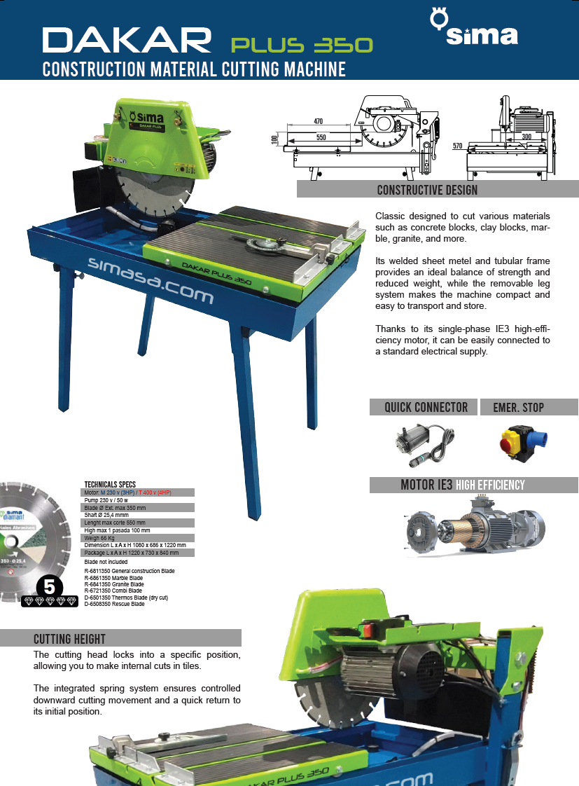Die SIMA Dakar Plus 350 ist eine professionelle Steintrennsäge im klassischen Design für Ziegel, Terrazzo, Marmor und Granit. Sie kombiniert ein geschweißtes Blech- und Rohrrahmen-Chassis für optimale Leichtigkeit und Widerstandsfähigkeit mit einem einfach anzuschließenden Einphasenmotor. Ihr höhenarretierbarer Schneidkopf ermöglicht Ausschnitte in Fliesen, während das integrierte Federsystem ein kontrolliertes Absenken und ein schnelles Rückstellen garantiert.