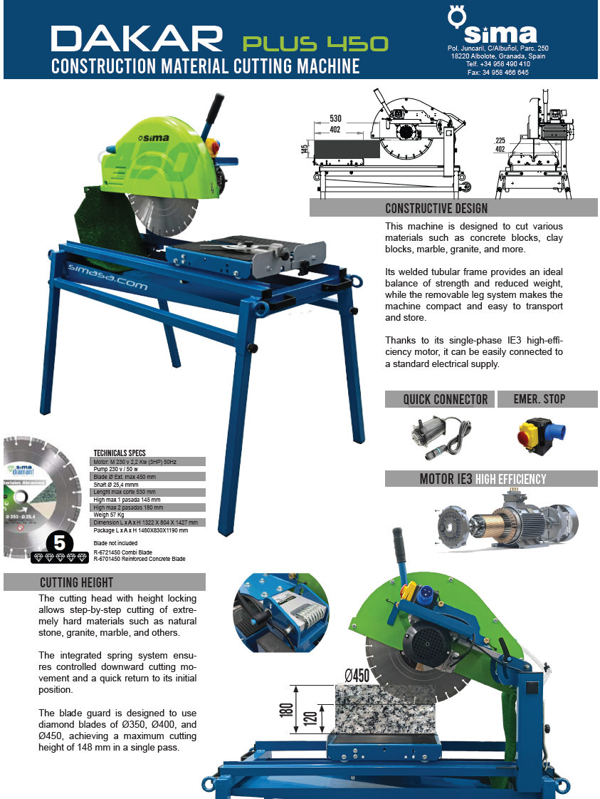 Die SIMA Dakar Plus 450 ist eine professionelle Steintrennsäge für hochfeste Materialien wie Beton, Marmor und Granit. Sie verfügt über einen robusten Rohrrahmen, einen Einphasenmotor und einen verstellbaren Schneidkopf mit Federsystem. Geeignet für Trennscheiben bis zu Ø450 mm, bietet sie eine maximale Schnitthöhe von 148 mm und lässt sich dank der abnehmbaren Standfüße leicht transportieren.