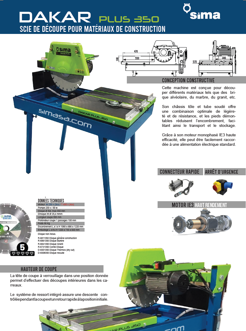 La SIMA Dakar Plus 450 est une scie à matériaux professionnelle conçue pour les matériaux de haute dureté tels que le béton, le marbre et le granit. Elle dispose d’un châssis tubulaire robuste, d’un moteur monophasé et d’une tête réglable avec système à ressort. Compatible avec des disques jusqu’à Ø450 mm, elle permet une hauteur de coupe maximale de 148 mm et facilite le transport grâce à ses pieds amovibles.