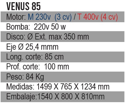 Las VENUS (modelos 125, 150 y 200) están dotadas de avance de corte mediante transmisión de correa dentada accionada por volante. Cuenta con un sistema de autolimpieza de la pista de rodadura mediante fieltros y protección abatible en todos los modelos.